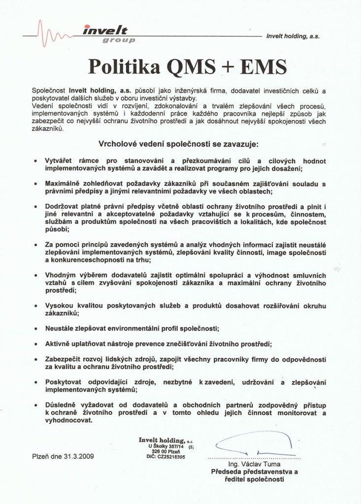 Od roku 2009 máme pro zabezpečení špičkové kvality našich dodávek a služeb zaveden systém řízení jakosti podle ISO 9001:2008 a dále systém environmentálního managementu podle ISO 14001:2004.